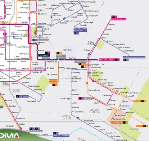 - Un service Flexo "à la carte", connecté au tram. De la station tram "Grand Marché" à l'entrée de la zone d'activités, pas besoin de réserver, il s'agit d'une ligne classique. Dans la zone, elle adapte son itinéraire selon les demandes des passagers à l'intérieur de la ZI de Chevigny. Dans le sens retour, il suffit d'appeler le 03 80 11 29 29.