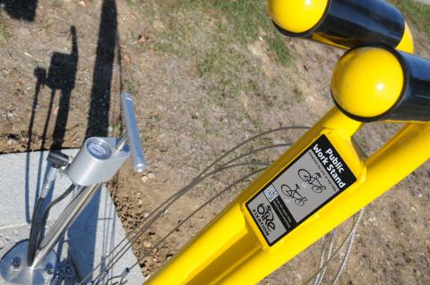 Une pompe à air et des outils, ainsi qu'une structure pour maintenir le vélo composent cette station.