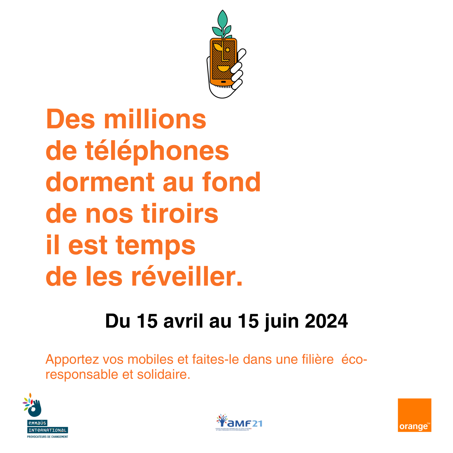 L’amf21 (association des maires de Côte-d’Or) et Orange vous invitent à participer à l’opération « Donnez une seconde vie à votre mobile » jusqu’au 15 juin 2024 en déposant votre/vos mobiles usagés dans des collecteurs installés aux accueils de la Mairie et de La Parenthèse. Ils seront recyclés dans une filière éco-responsable et solidaire.