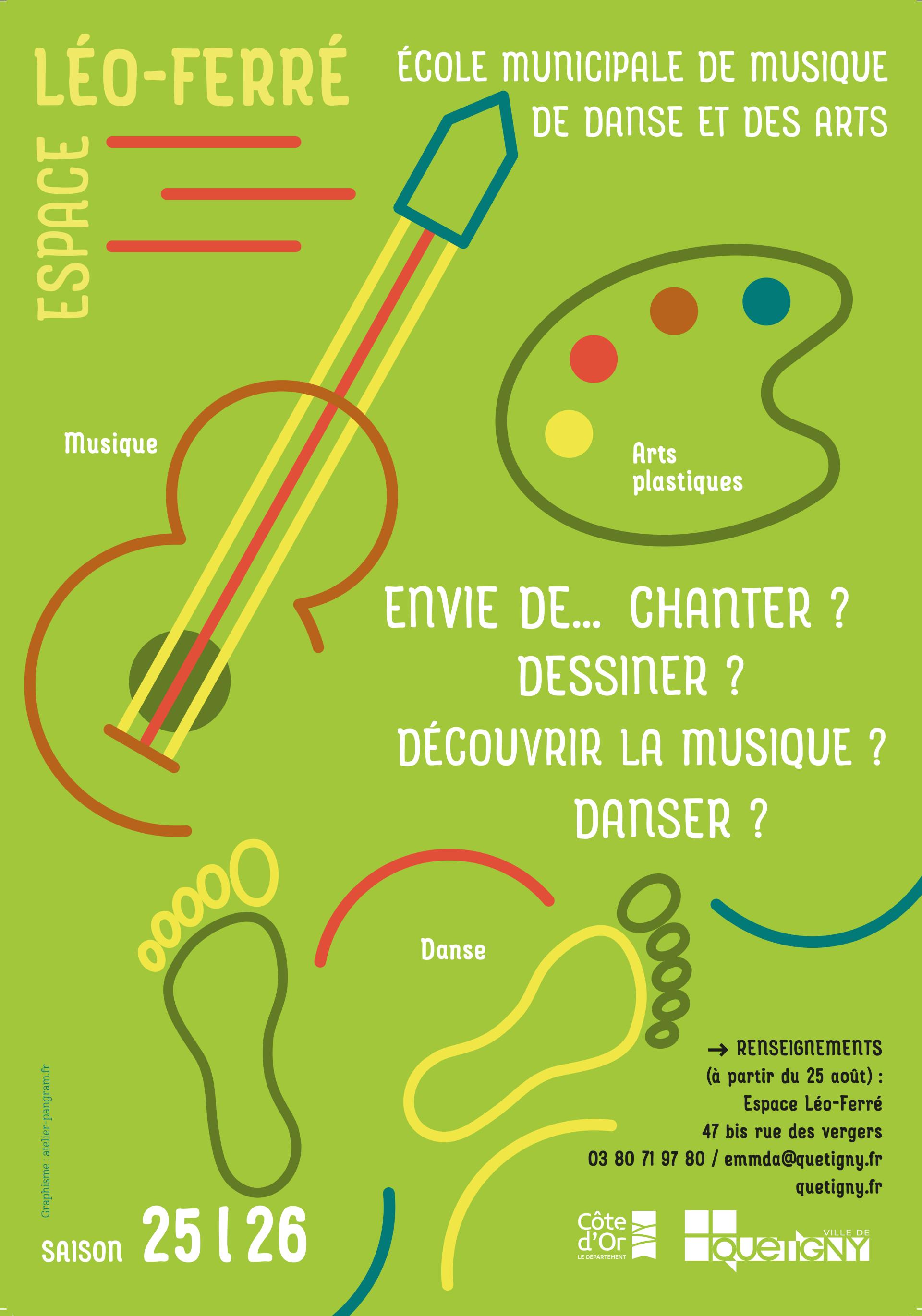 Envie de... chanter ? Dessiner ? Découvrir la musique ? Danser ? Avec l'école municipale de Musique, de Danse et des Arts. Renseignez-vous auprès de l'équipe à partir du 25 août à l'Espace Léo-Ferré, 47bis rue des Vergers, au 03 80 71 97 80 ou par courriel : emmda@quetigny.fr