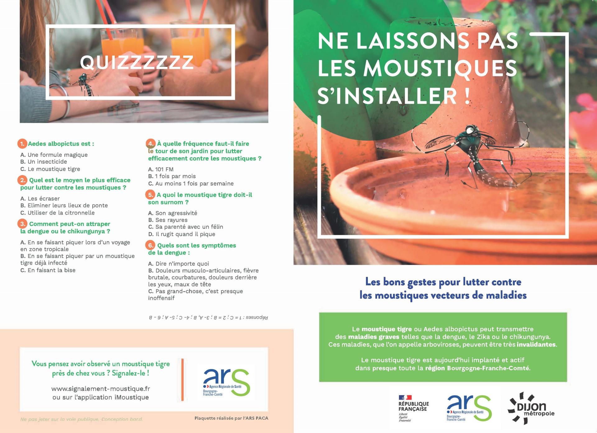 Bon à savoir ! Le moustique tigre est une espèce originaire d’Asie qui s’est rapidement propagée à travers le monde et notamment en Côte-d’Or depuis 2018. Reconnaissable à ses rayures noires et blanches sur le corps et les pattes, il a une ligne blanche sur le thorax. La capacité de cet insecte à être vecteur du chikungunya, de la dengue ou du virus zika, en fait une cible de surveillance prioritaire pour les autorités sanitaires et leurs partenaires, durant sa période d’activité en métropole, du 1er mai au 30 novembre. Il se reproduit dans de petits récipients d’eau stagnantes, tels que des vases, des pneus usagés, des pieds de parasols ou des soucoupes de plantes dans nos jardins, balcons et terrasses.