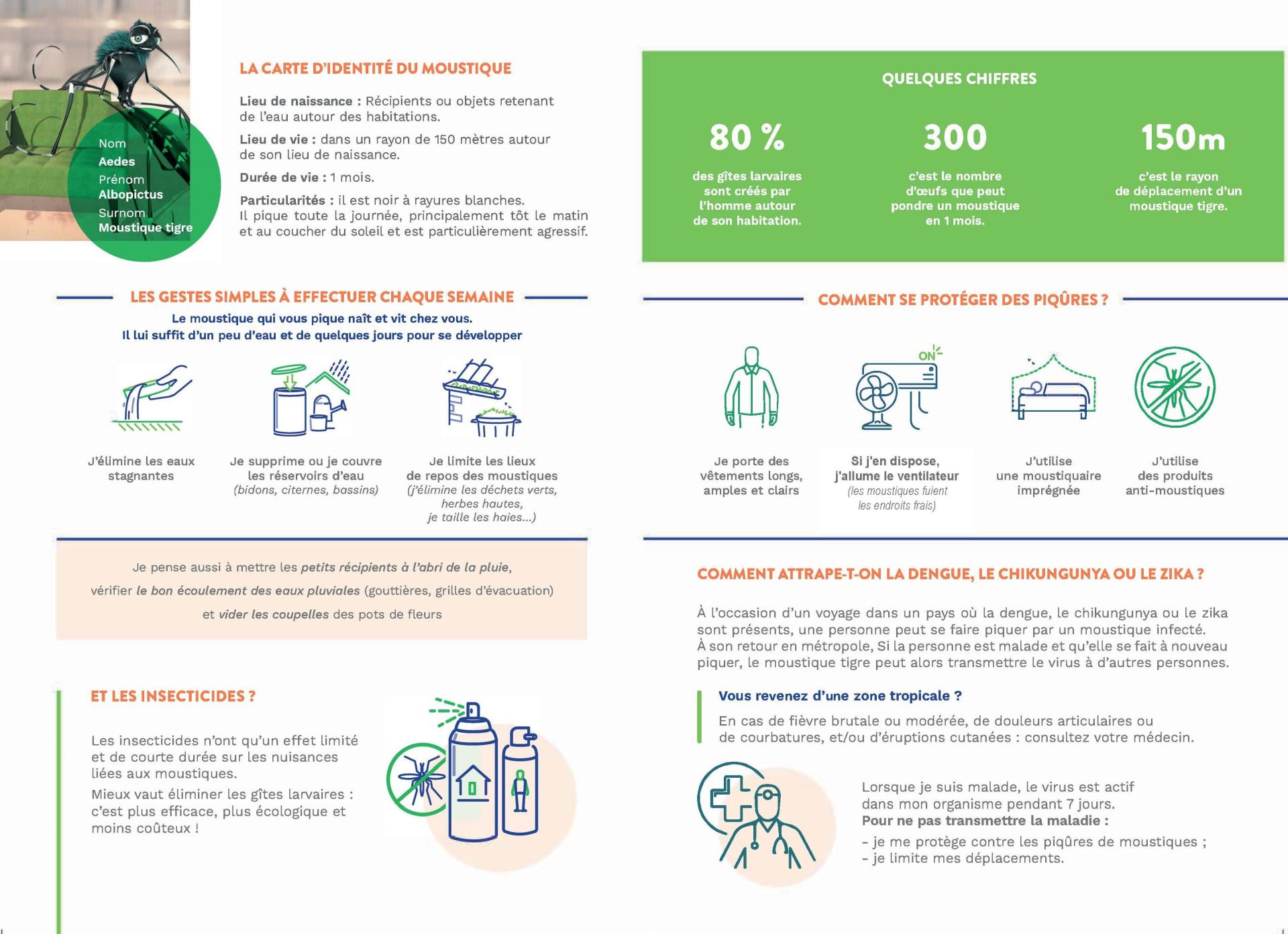 Pour contrer sa prolifération, nous devons tous ensemble adopter des gestes de prévention par l’élimination des sources d’eau stagnante (couvrir les récupérateurs d’eau de pluie, vider ou ensabler les petits réceptacles pouvant contenir de l’eau : soucoupes, pieds de parasol…), ainsi que par la protection personnelle contre les piqûres (port de vêtements longs, moustiquaires, etc.). Bâchez, couvrez, videz !
