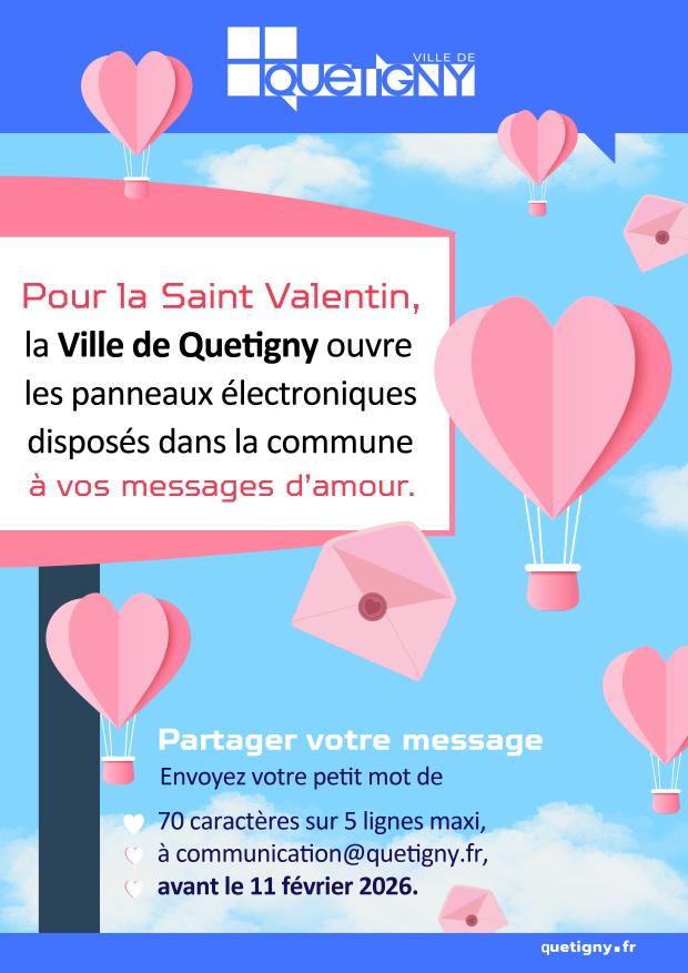 Comme chaque année, la Ville met à disposition ses panneaux électroniques dans toute la commune pour afficher vos messages d’amour le 14 février, jour de la Saint-Valentin !