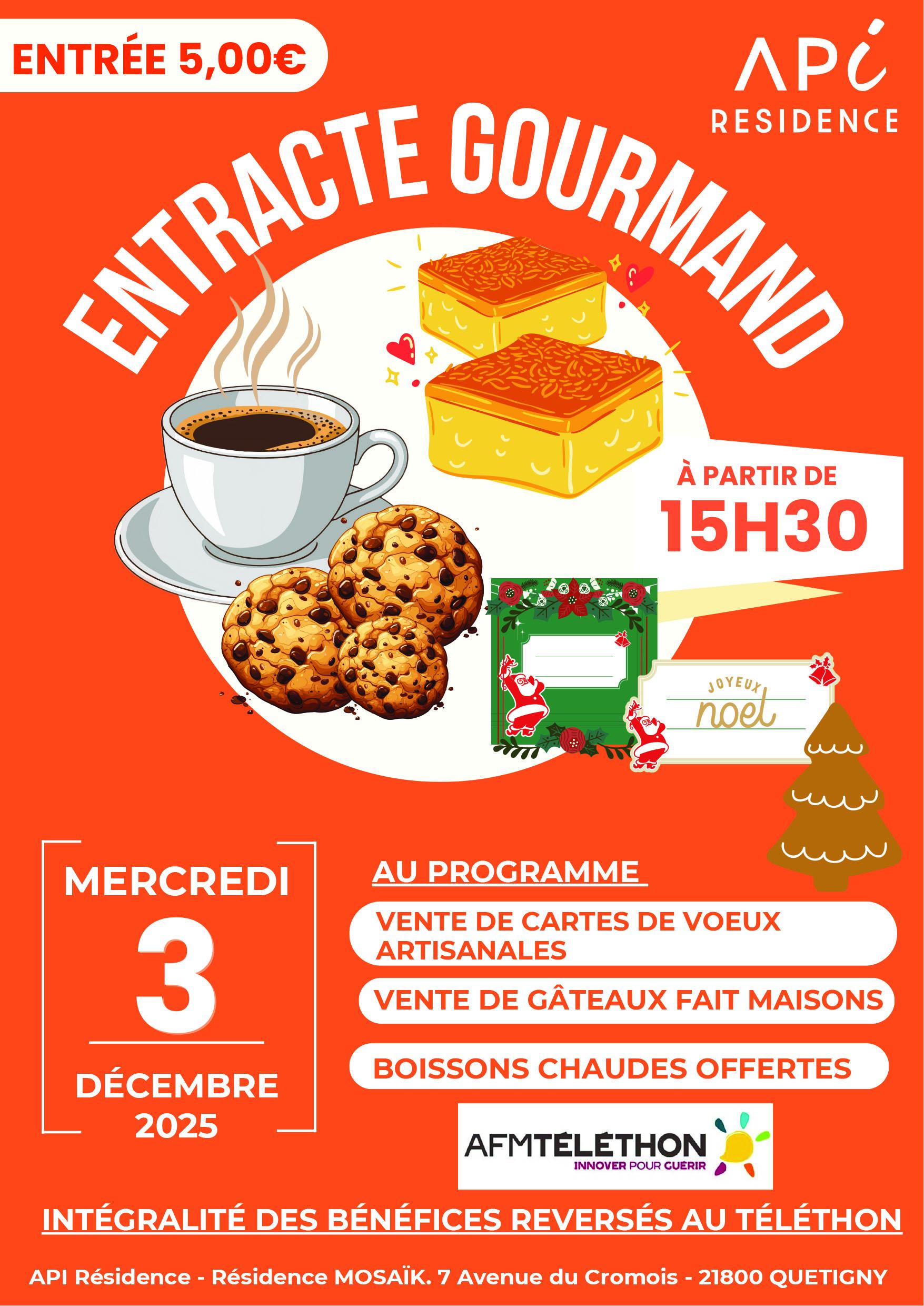 . Entracte gourmand ouvert à tous le 3 décembre de 15h30 à 18h00 à la résidence services senior Mozaïk – 7 av. du Cromois - avec au programme boissons chaudes offertes, ventes de cartes de vœux artisanales (1€), et de gâteaux fait maison (1€). Entrée 5 €. L’intégralité des bénéficies seront reversés au Téléthon