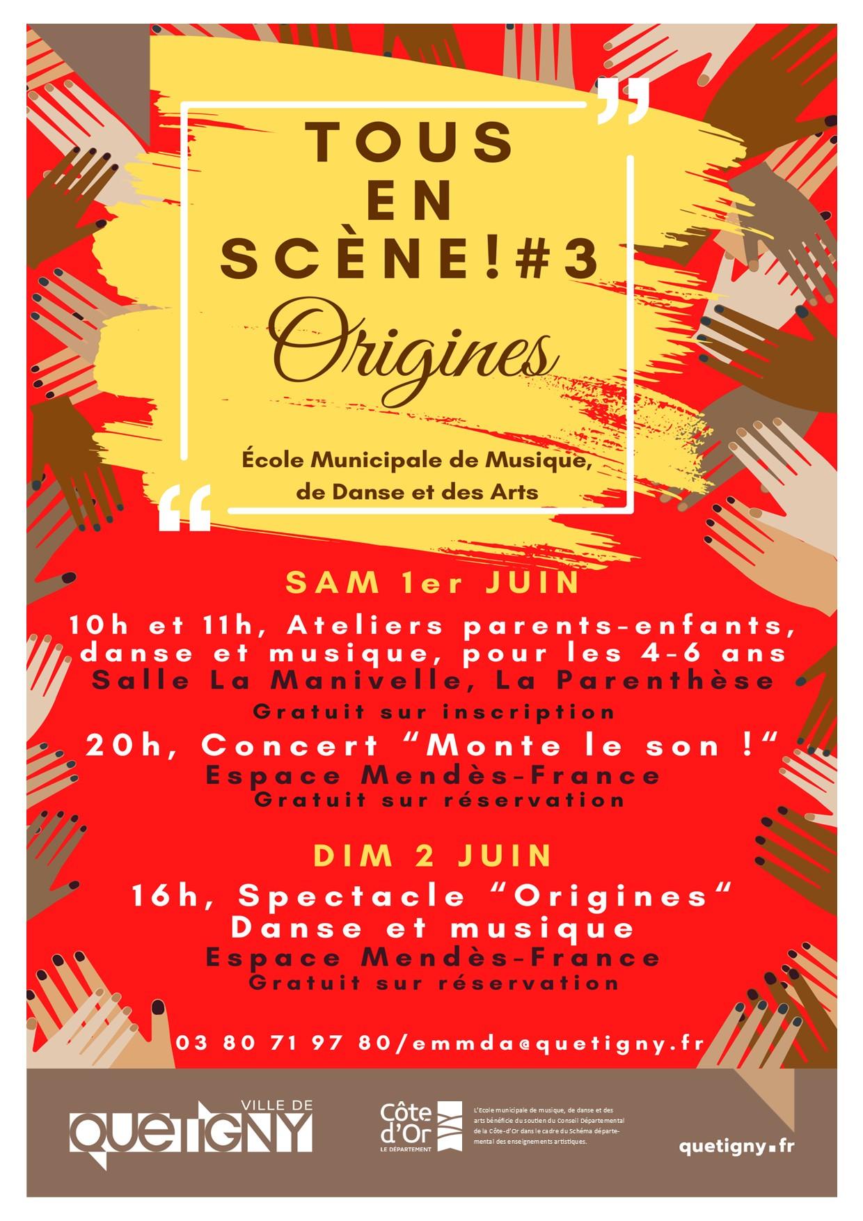 - Dimanche 2 juin, à 16h, spectacle danse et musique « Origines », à l’Espace Mendès-France, avec tous les ateliers de danse (60 élèves environ), la chorale enfants, quelques pianistes et la classe de flûte traversière, là encore environ 90 danseurs et musiciens sur scène !